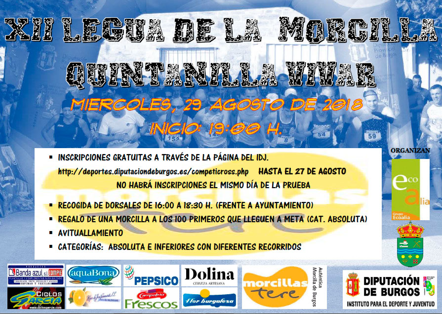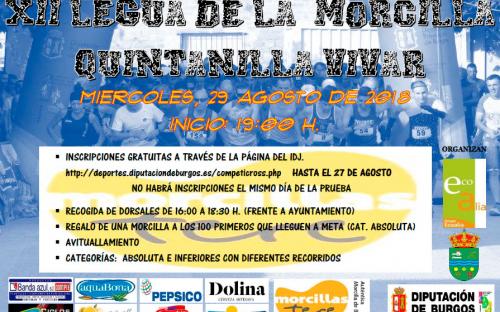 Este año, la XII Legua de la Morcilla que se celebrará en Quintanilla Vivar, cumple 12 ediciones. Será el próximo miércoles 29 de agosto, con el objetivo de disfrutar de una tarde deportiva y divertida para todas las categorías.